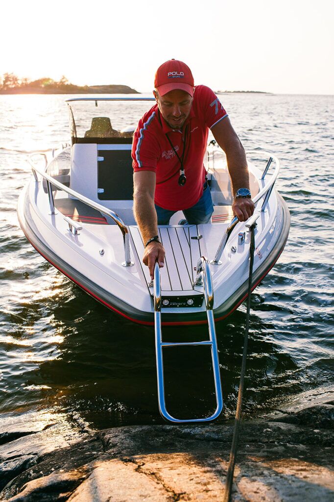 En smart stege som gör det lättare att ta sig i land från båten. Luckan i fören är anpassad för att förvara stegen när den inte används.
